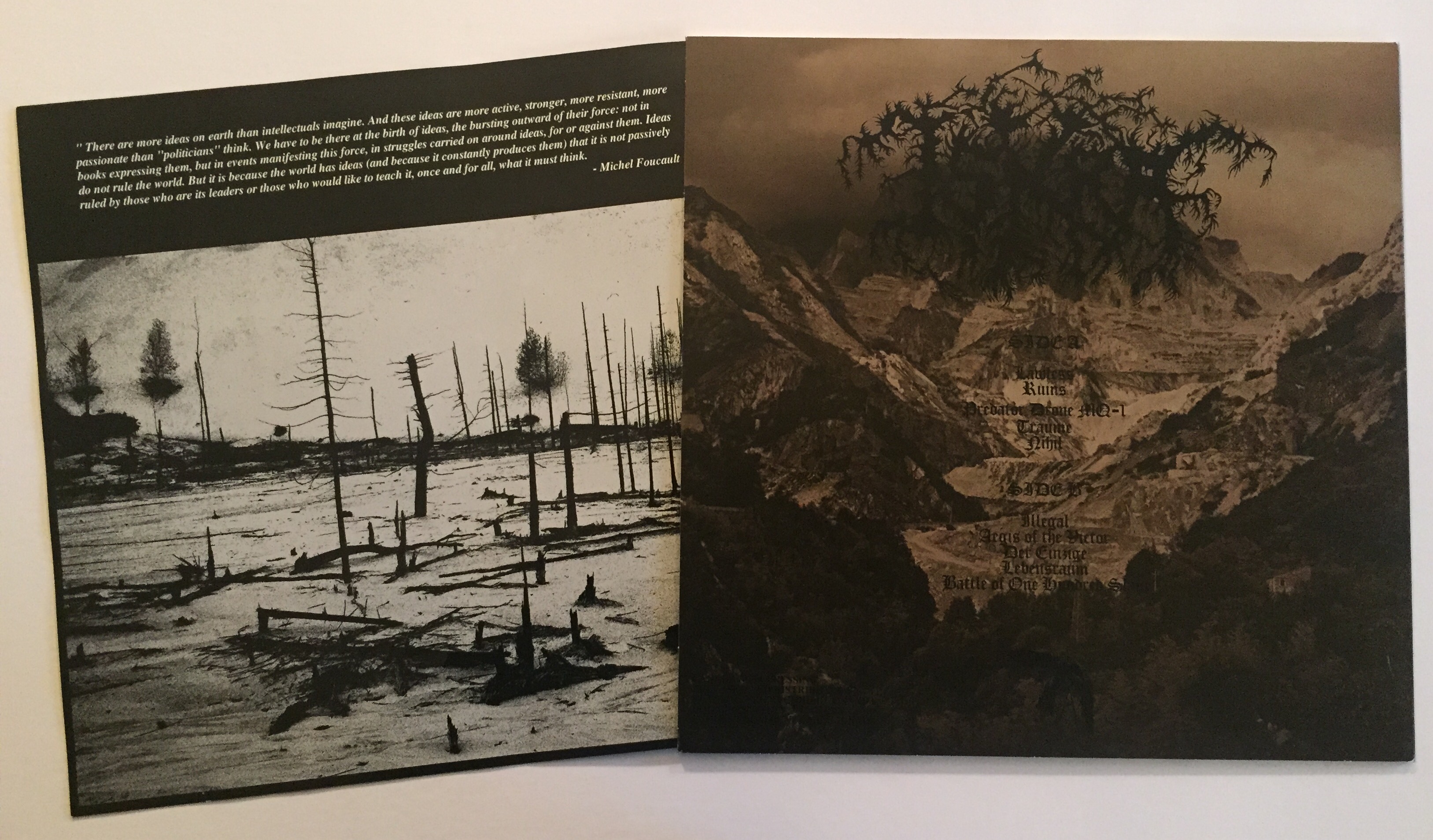 "Ruins" contains 10 punishing songs with lyrics ranging from anarchist theory, military drone strikes on civilian populations, historic native american battles against european colonialism, and a yearning to be free from draconian laws. Combined with over the top riffs, devastating blast beats, pulverizing toms, and the occasional dive bomb this LP will leave your speakers smoldering. Not only is this one of the most intense records PROFANE EXISTENCE has ever done it, is also one of the most beautiful presentations we have seen in recent years. The stark mountainous cover resembles Middle Earth artwork but the real gem is the 11in x 11in 12 page booklet inside. Printed on glossy paper, this booklet contains not just lyrics but very thorough explanations of each song. This vinyl release is financed by a number of DIY labels from around the united states and Canada. Including, PROFANE EXISTENCE RECORDS (USA), BLACK RAVEN RECORDS (CAN), DOOMED SOCIETY RECORDS (CAN), WAR ON MUSIC (CAN), WHAT IS MAKING US SICK (CAN), NOCTURNAL RIEGN (USA), and ECHOES FROM BENEATH (CAN).