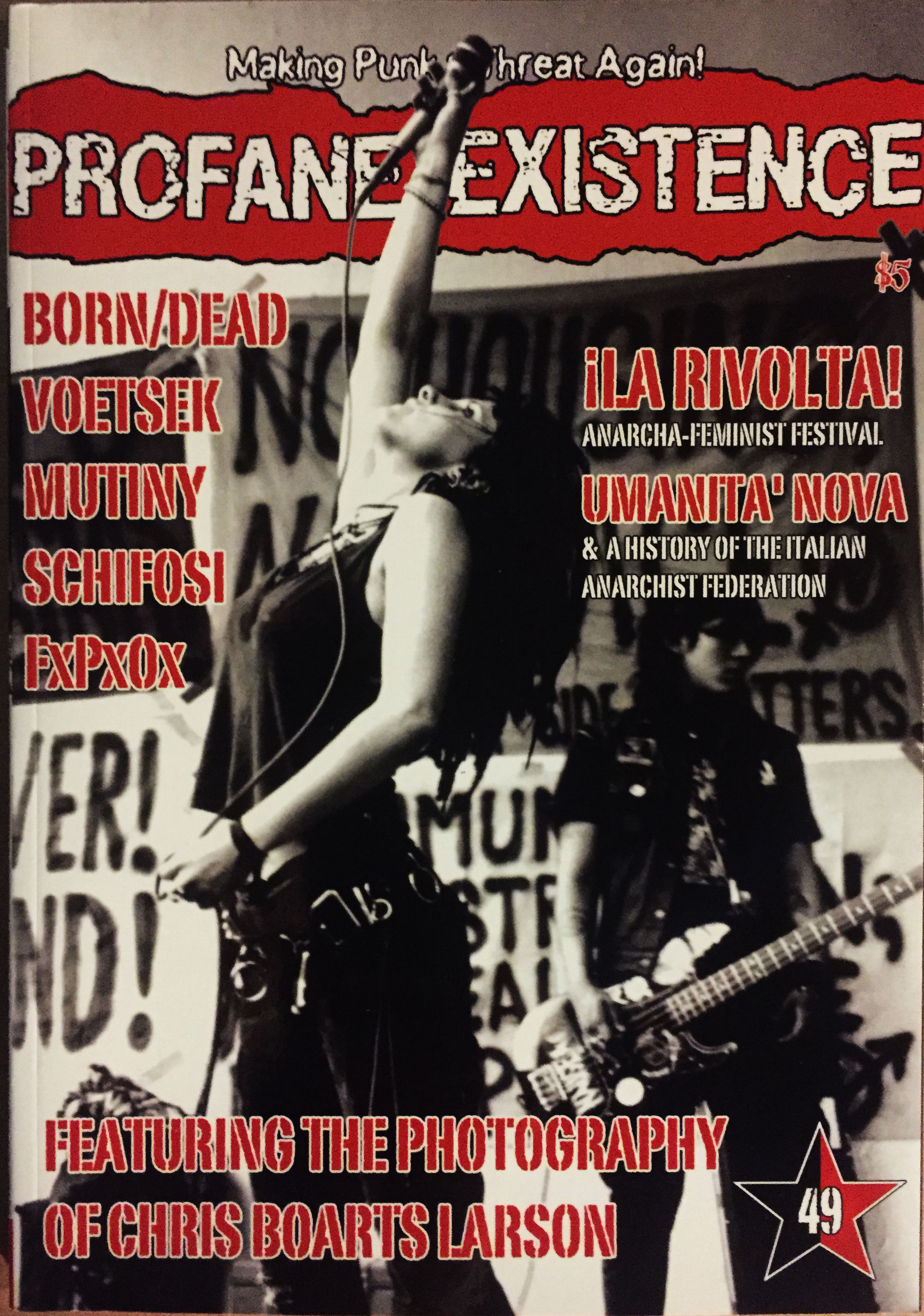Just in time for summer, we have another action-packed issue of PE. Bands featured in this issue include BORN/DEAD, VOETSEK, MUTINY SCHIFOSI and FxPxOx.This issue's featured artist is photographer and Slug and Lettuce editor Christine Boarts-Larson, whose interview and gallery is more than 20 pages long and contains almost 100 photosgraphs! There is also an extensive article on the recent ¡La Rivolta! festival in Boston (modeled loosely on the CLIT Fest in Minneapolis) written by Erika Ransom of THE PROFIT$. There is also an extensive history of the Italian Anarchist Federation and newspaper Uminta' Nova, plus Naked Maygun's regular vegan recipes section. This is all in addition to the usual columns, letters and extensive review sections.