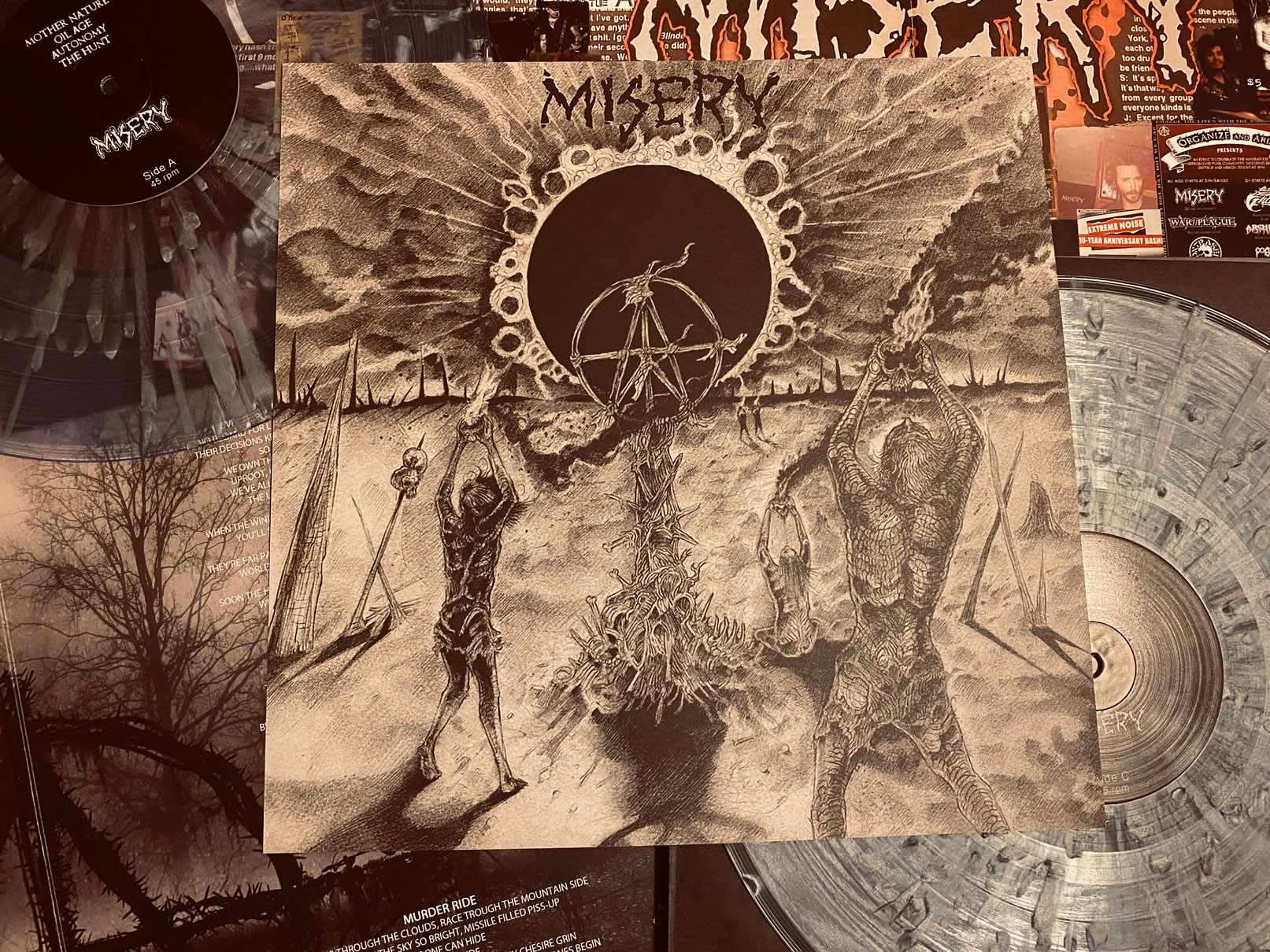 The first of the two songs I heard was the opening track, “Mother Nature”. From the dark and apocalyptic introduction to the slow build-up with Gary’s tribal drums and the haunting sound of a crow in the background, this is the ultimate record-opener. When it kicks into full gear and we finally hear the buzzsaw guitars kick in, we know that this record is a force to be reckoned with. From this point onward, there is not a single let down on this record. MISERY have rejuvenated themselves after years of relative silence and real life bullshit getting in the way. The world is in a much worse spot than it was in 2003, and the songs reflect that. Unlike other “apocalyptic crust” bands out there, these songs aren’t just some abstract “epic” metal songs with a vague “end of the world” theme; nor are these clichéd empty slogans. From the mourning cry of “Mother Nature” and “Just Never Ends” to the matter-of-fact “Oil Age”; from the bleakness of the soldier’s tale “Ready Aim Fire” to the somewhat hopeful “All of Us” and all points between, the lyrics are just as top-notch as the songs themselves.