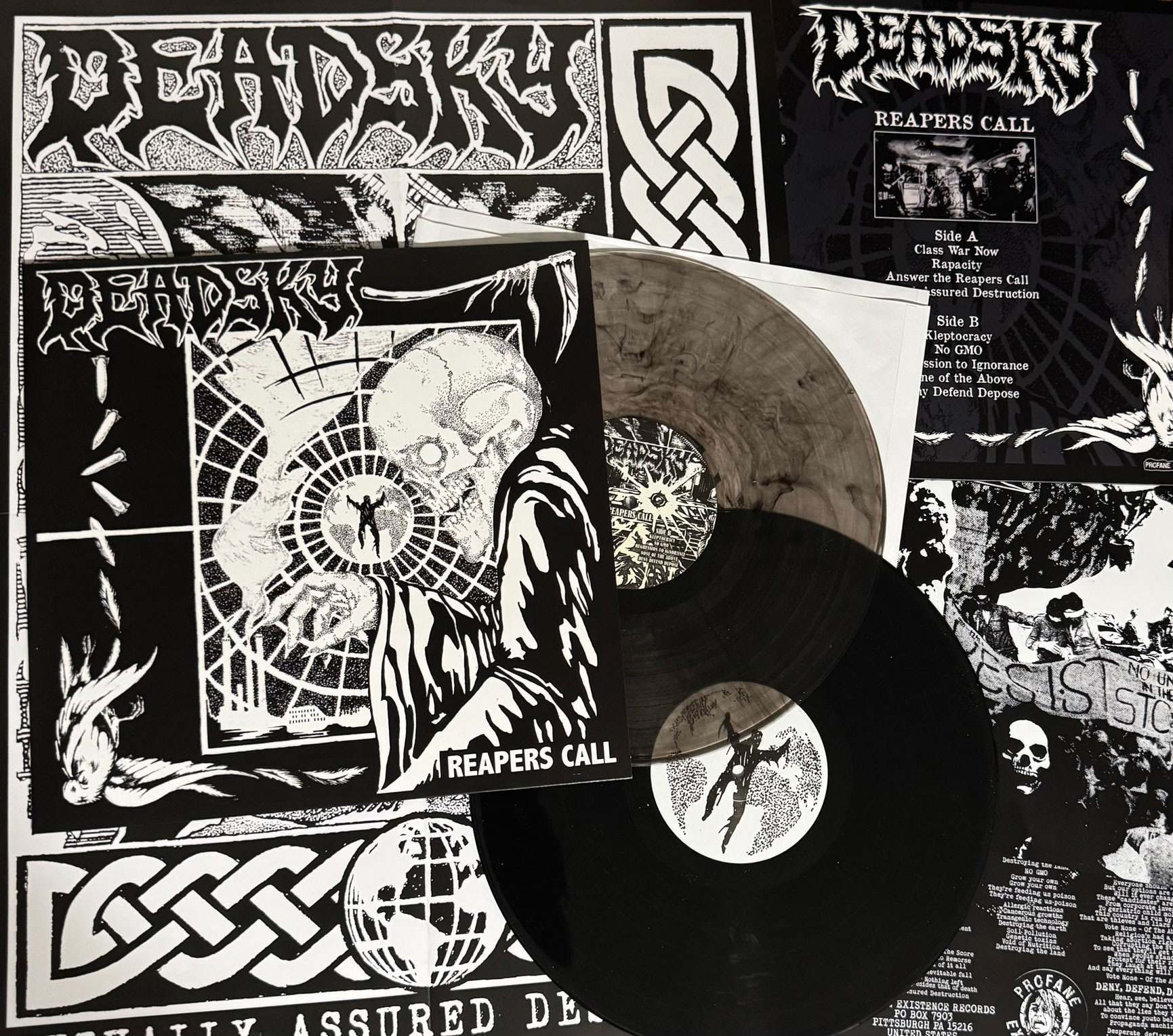 DEADSKY have been developing a hardcore following over the last three years and have put together a massively crushing LP. Taking elements from old school D-beat, crust, and thrash metal DEADSKY have a sound that is almost underground 80’s metal but yet is still punk as fuck. Political charged blackened crust that is as equally uncompromising as it is devastating. The opening track “Class War Now” starts off with a very SLAYER meets SWORDWIELDER vibe before steamrolling into raging d-beat crustcore that takes no prisoners. It only progresses from there as metallic riffs, thundering drums, chilling samples, and hardcore breakdowns are combined with immensely huge vocals to unite in an all attack against the system. Highly recommended for fans of S.D.S./ANTISECT/ENT ect. You can easily tell the band put a great deal of time and energy into this release. True to the DIY spirit DEADSKY recored every bit of this record themselves in a home studio and then had it mastered for vinyl by our good friend Jay Mathersoon at Jam Room Studios. Joe B’s cryptic artwork matches the sound perfectly creating a modern day masterpiece. “Reapers Call” will be an available on LP and Cassette this summer on the legendary PROFANE EXISTENCE.